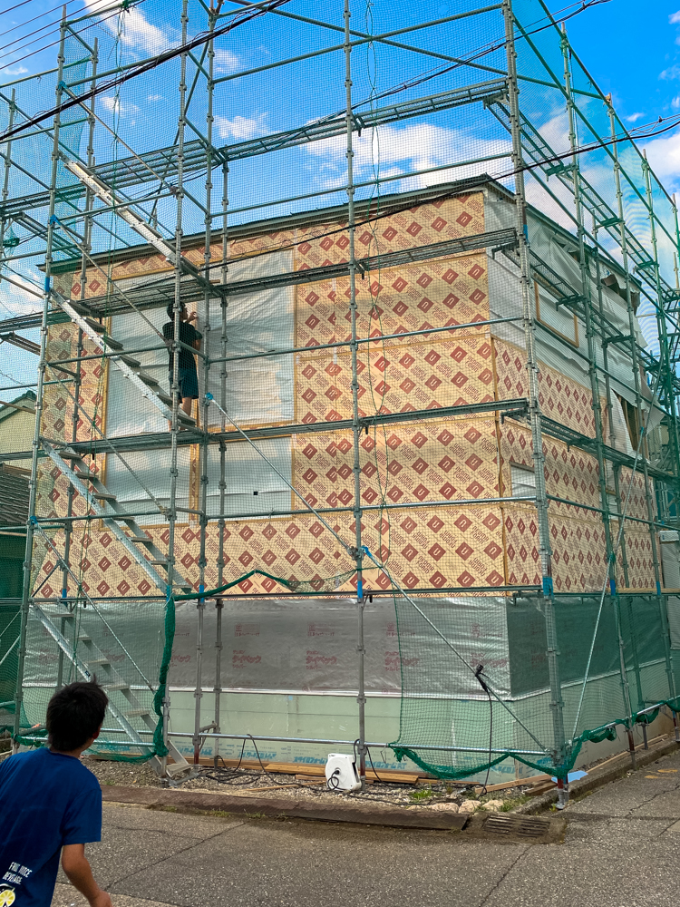 5月末に建て方工事が終わり、現在外装工事を行ってます。
